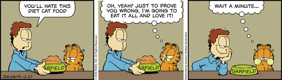 Джон: ты возненавидишь эту диетическую кошачью еду Гарфилд: о, да? Только чтобы доказать твою неправоту, я всё это съем и полюблю Минуточку...