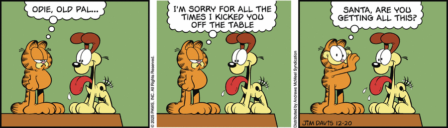 Гарфилд: Оди, старый друг... Я извиняюсь за всё то время, когда скидывал тебя со стола. Санта,ты видишь всё это?