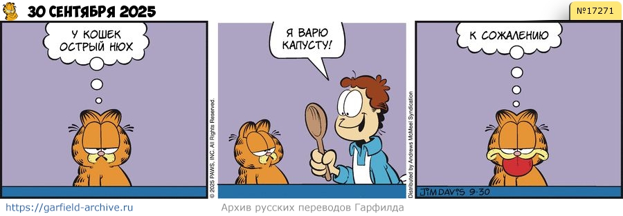 Гарфилд: У кошек острый нюх Джон: Я варю капусту! Гарфилд: К сожалению,